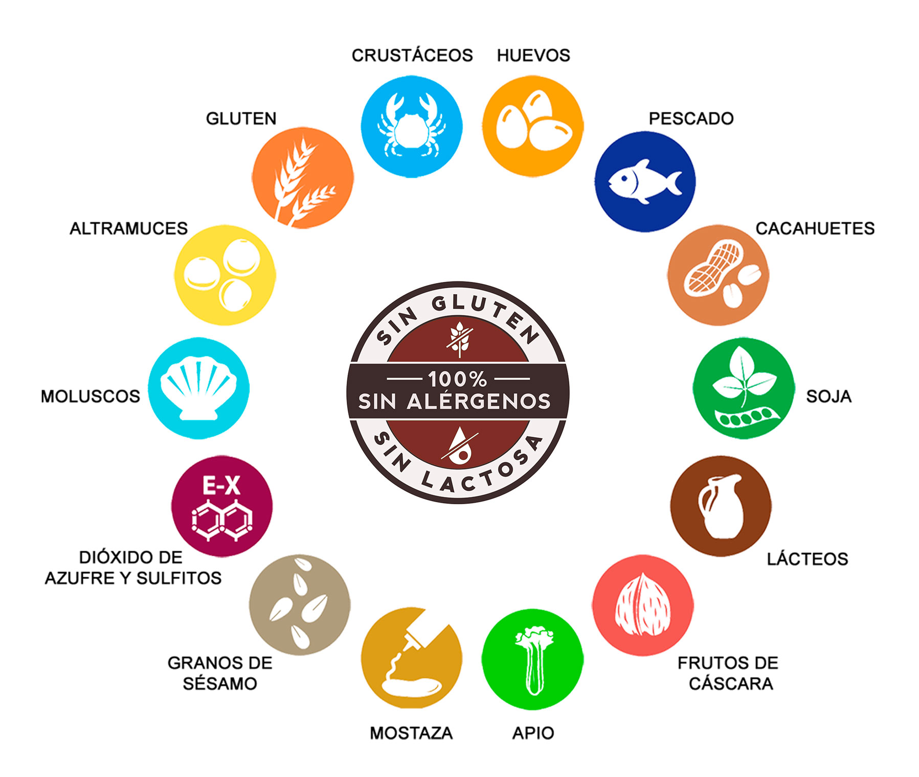 Nuestros ibéricos se elaboran sin ingredientes que contengan los 14 alérgenos principales según la normativa europea. Los alérgenos eliminados incluyen gluten, crustáceos, huevos, pescado, cacahuetes, soja, leche y derivados, frutos de cáscara, apio, mostaza, sésamo, sulfitos, altramuces y moluscos.
